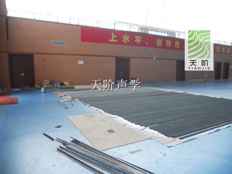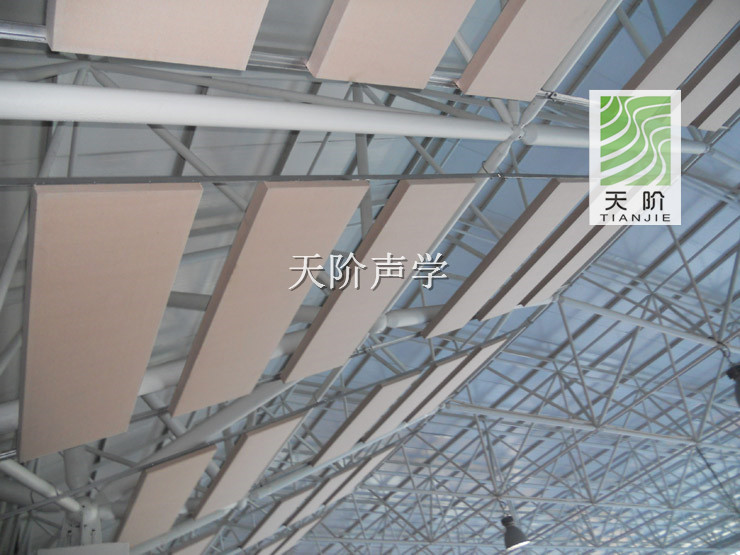 同時體育館頂棚也裝有具高效天階平板吸收性能的空間吸聲體。天階平板空間吸聲體是由優質玻璃纖維棉、定制鋁質邊框、吸音防塵玻纖布組成。它是其他聲學材料吸聲行能的2倍。從而大大減少了體育館的回聲。