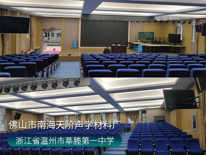 浙江省溫州市瑞安市農場村莘塍第一中學會議廳項目,墻面使用穿孔吸音板,基材選用不燃堅硬的玻鎂基材,飾面選用溫和的色調。整齊穿孔吸音板,吸音效果顯著,能吸收活動期間的噪音,回聲。