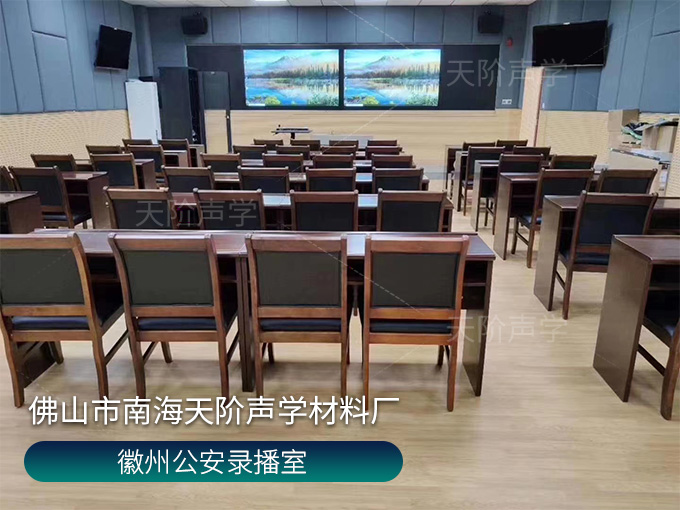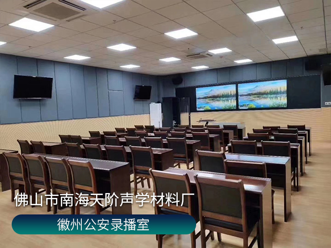 州公安錄播室 選用長(zhǎng)條槽木吸音板與軟包吸音板搭配使用,吸音效果顯著。