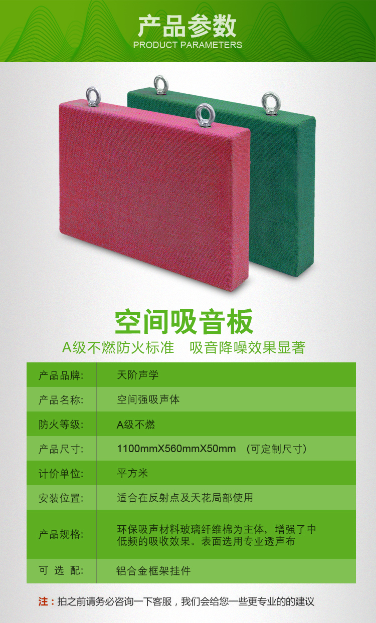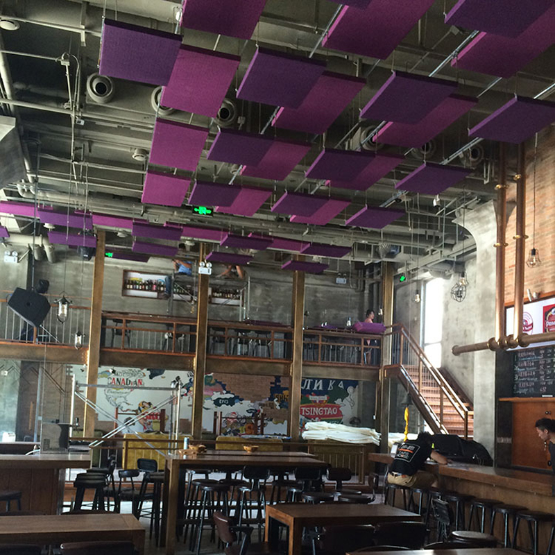 房間凈高的1/5至1/7左右,達(dá)到吸聲及裝飾的要求;若條件允許,可掛得更低些,離聲源近些。為了提高懸掛空間吸聲體的建筑裝修效果,應(yīng)對(duì)空間吸聲體的形式、色彩、懸掛方