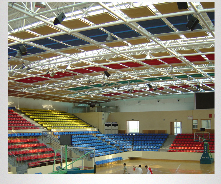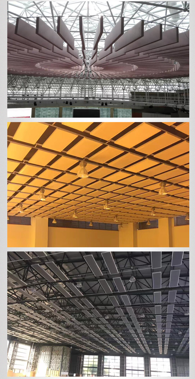 飾要求和聲源特性,可有板狀、方塊狀、柱體狀、圓錐狀和球體狀等多種形狀。其中板狀的結(jié)構(gòu)最簡(jiǎn)單,應(yīng)用最普遍。空間吸聲體多用于室內(nèi)體育館,其各式各樣的形狀、擺設(shè)方