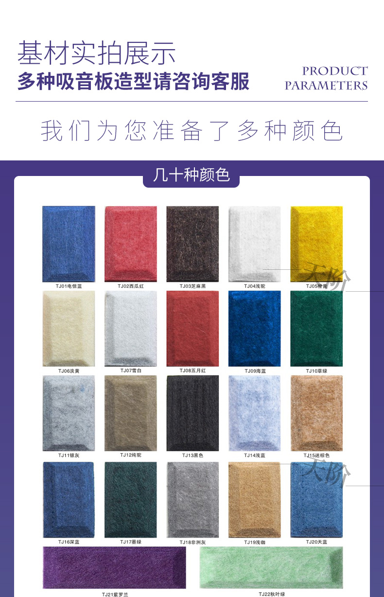 聚酯纖維吸音板又稱聚酯吸音板或纖維吸音板,是一種理想的吸聲裝飾材料。具有環保、阻燃、易除塵、易切割、可拼花、施工簡便、性價比優等特點,有多種花紋和顏色可供選擇,可滿足不同風格和層次的裝修要求。聚脂纖維吸音板在國內裝飾材料和聲學工程領域,應用非常廣泛,得到眾多國內**聲學專家的肯定與贊揚,并深受各界室內設計師、聲學設計師之信賴和選用,成為國內大部份城市的建筑聲學、產品降噪等工程的材料首選。