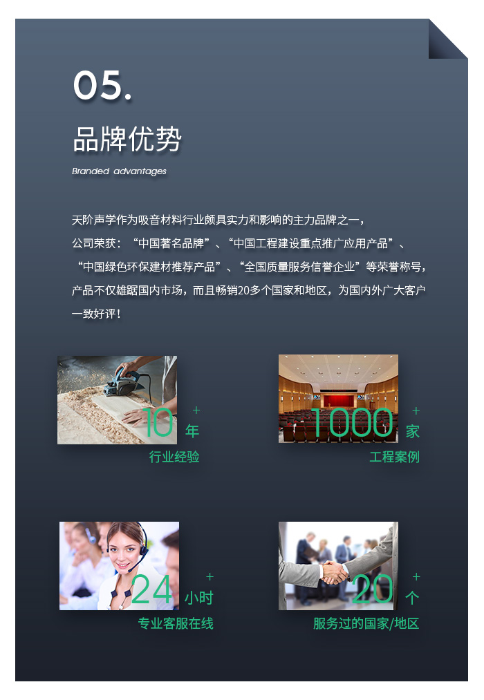佛山市南海天階聲學材料廠作為當今中國吸音材料行業具有實力和影響的主力品牌之一,公司榮獲:“中國著名品牌”、“中國工程建設重點推廣應用產品”、“中國綠色環保建材推薦產品”、“全國質量服務信譽企業”、等榮譽稱號,產品不僅雄踞國內市場,而且暢銷多個國家和地區,為國內外廣大客戶一致好評!