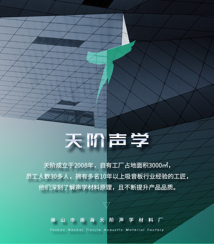 佛山市南海天階聲學材料廠前身為廣州天階聲學材料有限公司,成立于2008年,后因擴大經營注冊成立佛山市南海天階聲學材料廠,工廠占地3000多平米,從單一的生產銷售到:聲學設計-生產-銷售-聲學工程施工一體化,是一家專業的聲學環境解決方案綜合服務商。