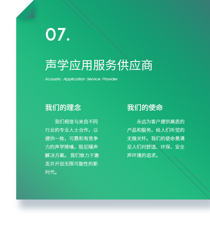 公司主營:槽孔木質吸音板、陶鋁吸音板、砂巖吸音板、布藝吸聲板、吸音軟包、微孔吸音板、碳塑吸音板、聚酯纖維吸聲板、隔音板、隔音氈、隔音減震墊、減振器,干掛板與聲學活動隔斷、固定高隔間等各種聲學材料。