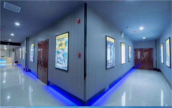 。電影院收銀臺墻面與吊頂位置采用生態木穿孔吸音板、影城走廊兩側采用環保13/3槽孔吸音板。影視廳內墻面采用聚酯纖維吸音板。聚酯纖維吸音板共用800┫,環保槽孔吸音板210平方米,生態木穿孔吸聲板185平方米。