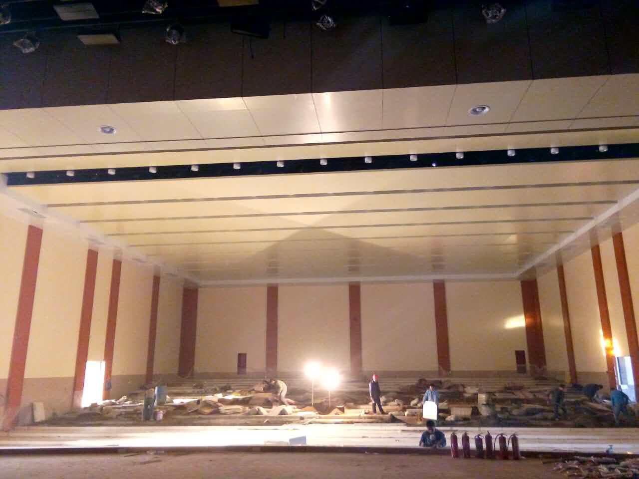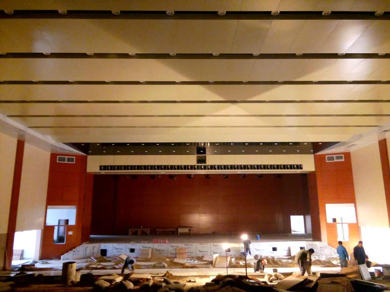 山東濱州濱化報告廳墻面吸音板,木質槽木吸音板28/4紅櫻桃阻燃吸音板500平方,E32/8孔木吸音板600平方,現已經完工,具體吸音板效果如下