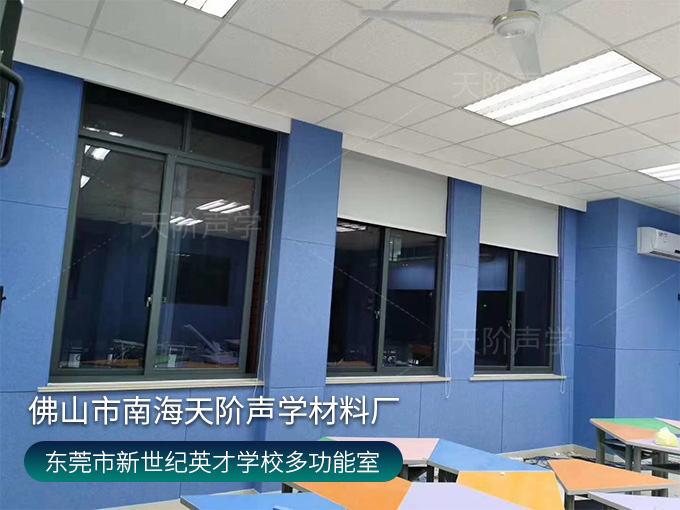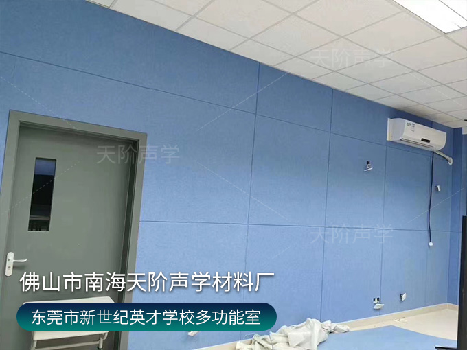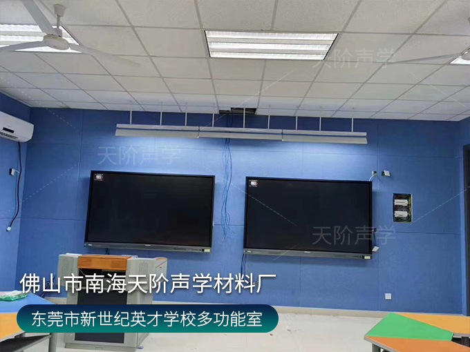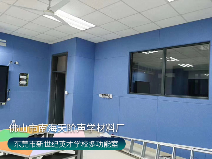 東莞市鳳崗鎮(zhèn)鳳崗新世紀(jì)英才學(xué)校錄播室項(xiàng)目,選用活力的藍(lán)色聚酯纖維吸音板,減少錄入回聲、雜音。