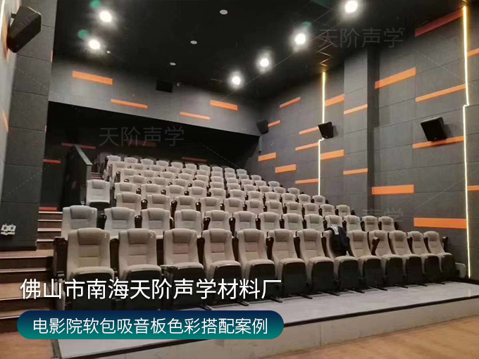 低調高雅的灰色灰色調電影院,墻面選用聚酯纖維吸音板,拼色安裝設計,做不燃處理,舒適又安心,吸收噪音雜音很有效果。